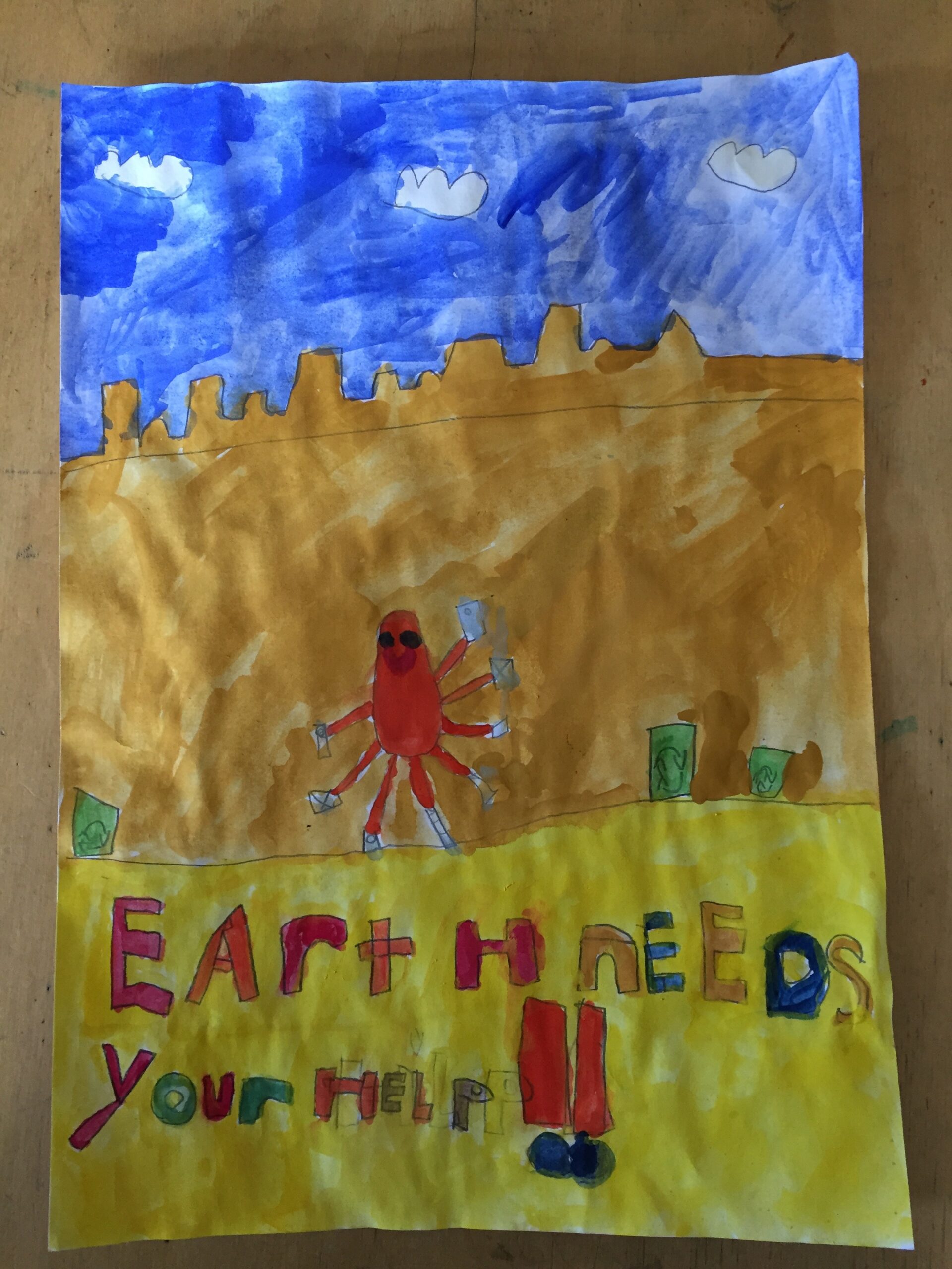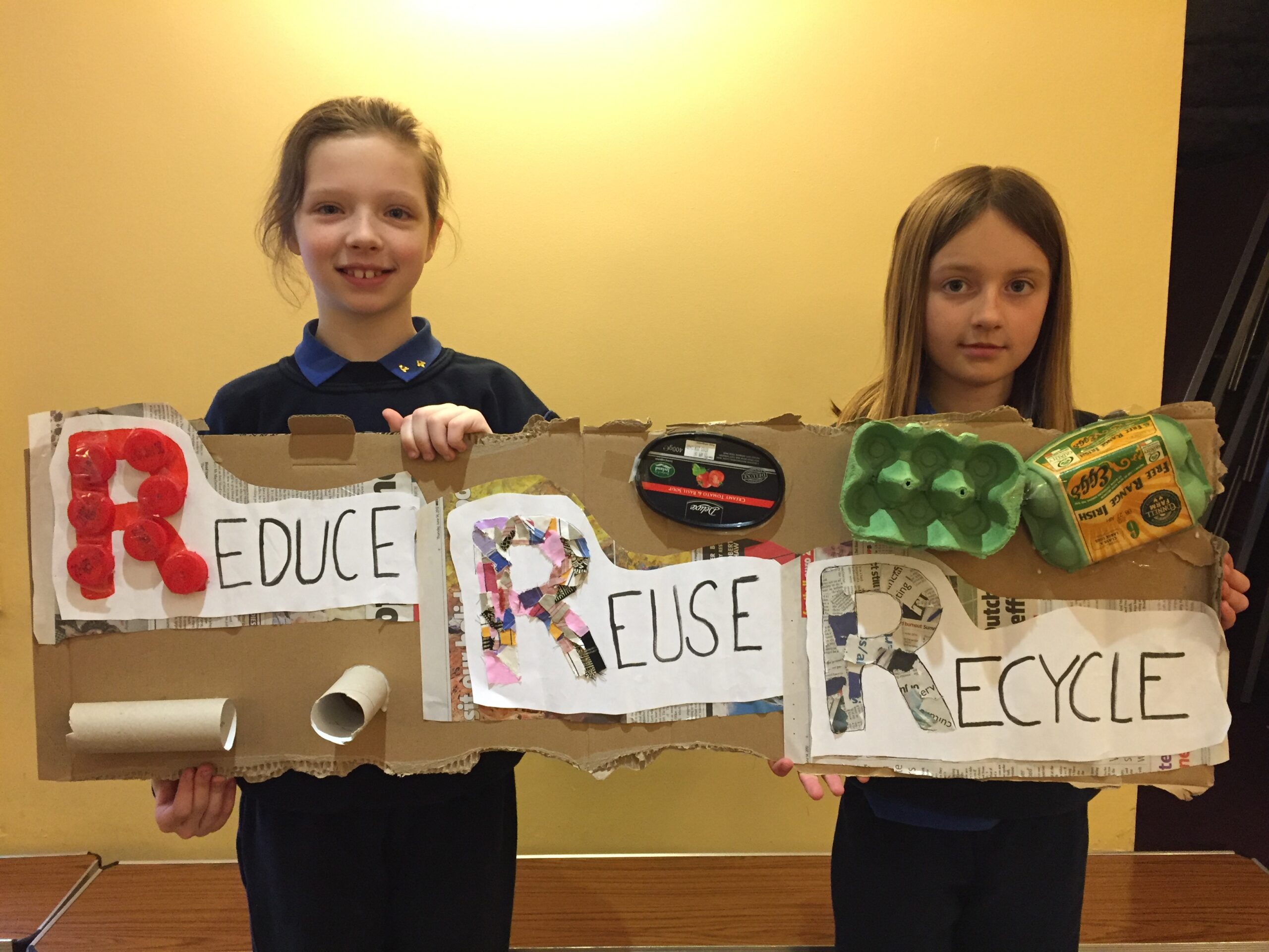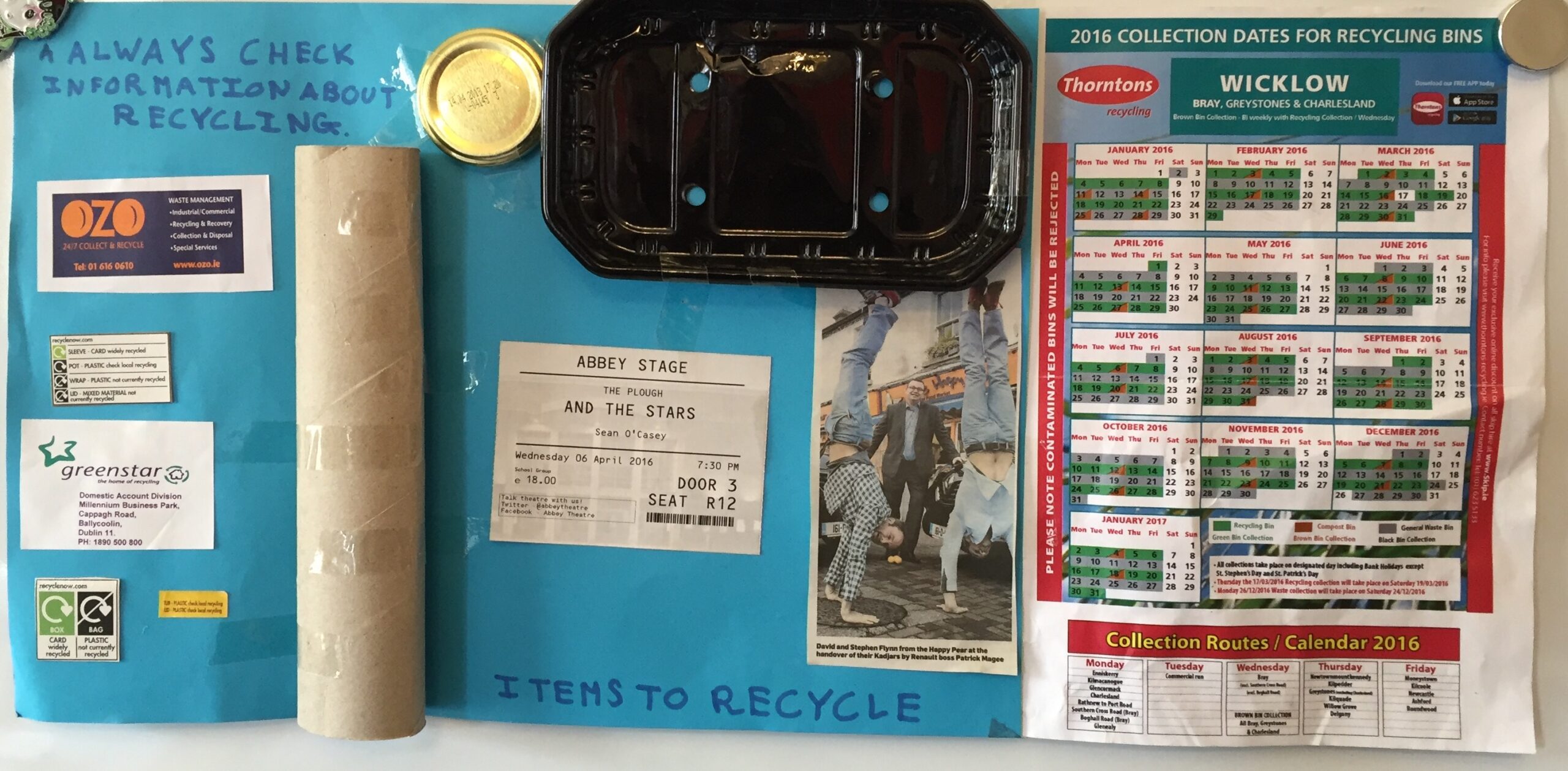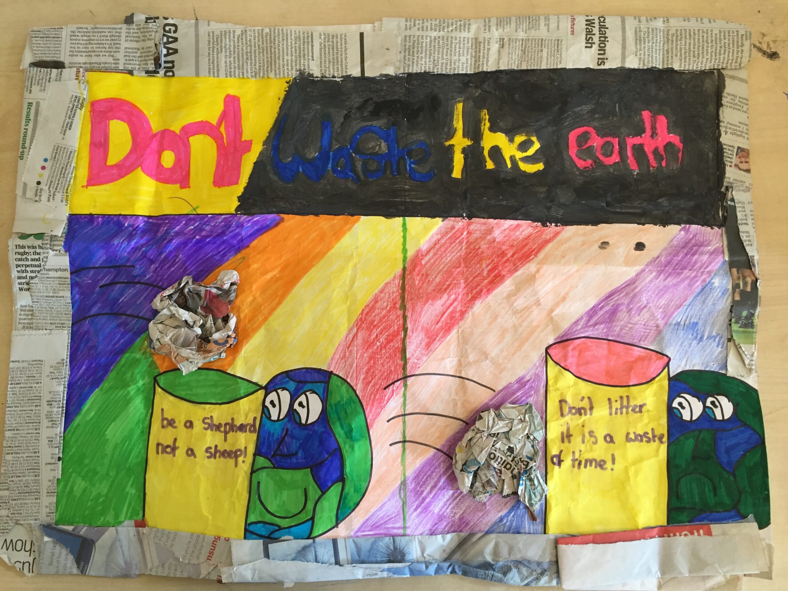 Some classes have gone one step further and not only made posters to promote recycling but they made their posters using recyclable goods. Below is an example of this from Saorla and Lulu in 4th class. We even had a robot creation called Rocky Recycle made by Danu and Gabrielle.