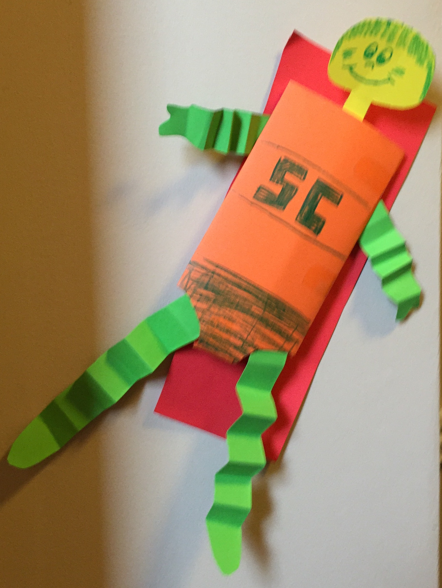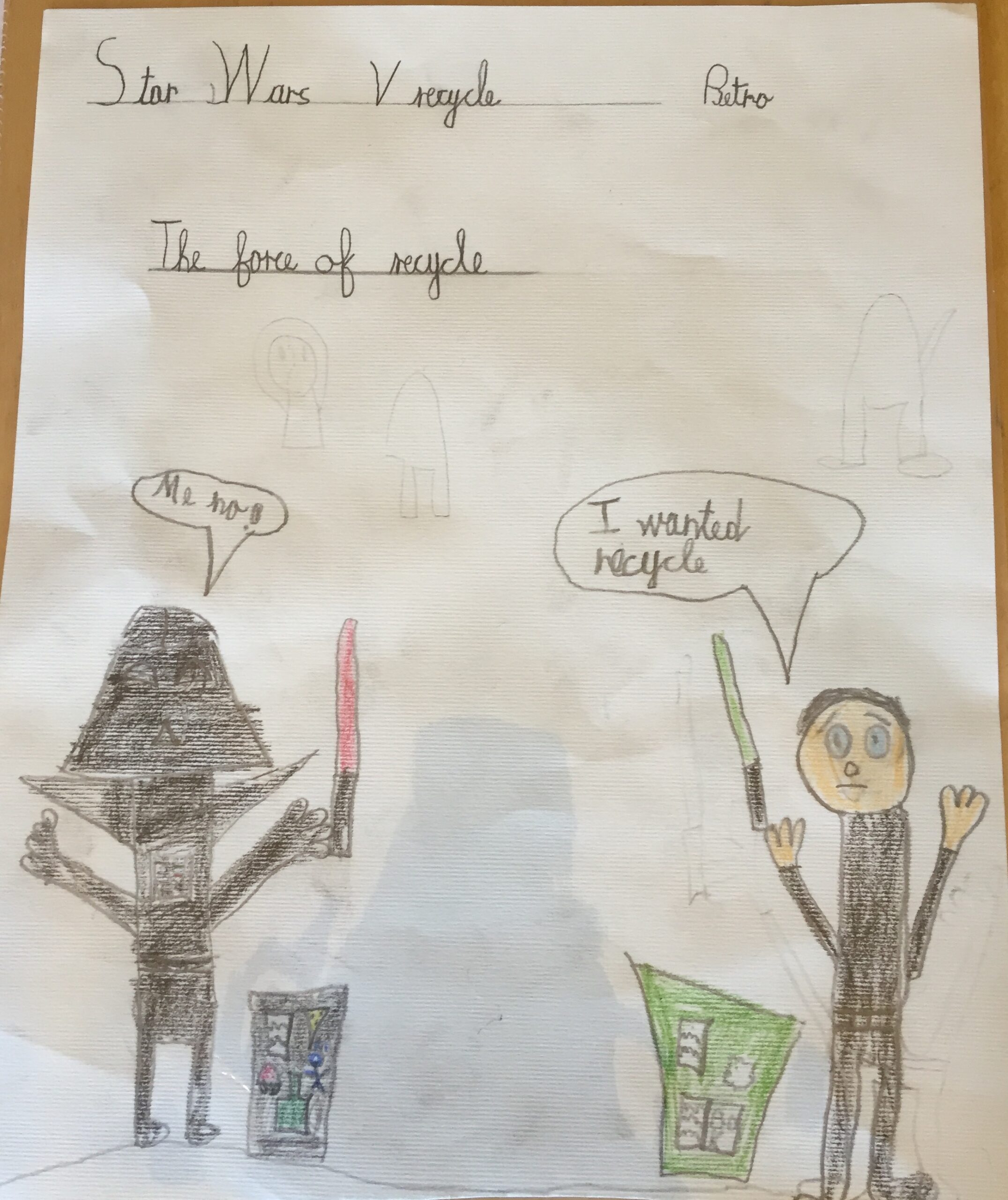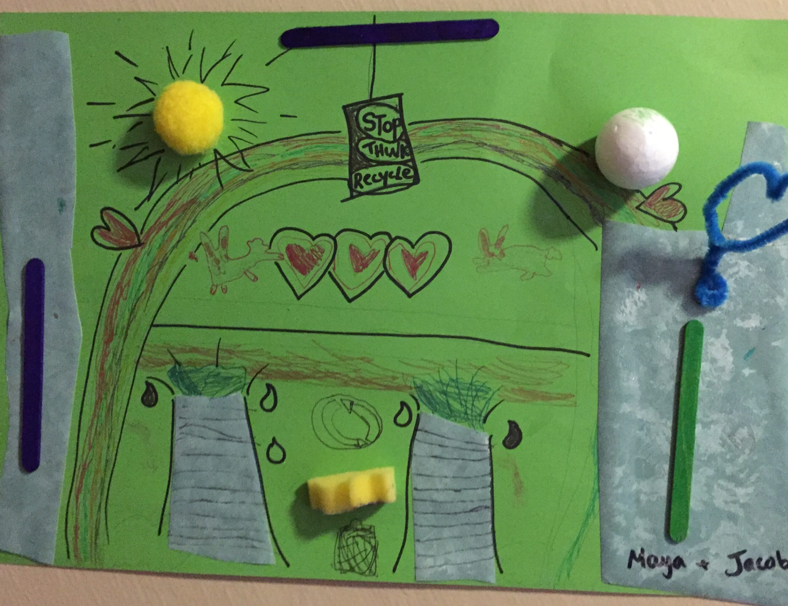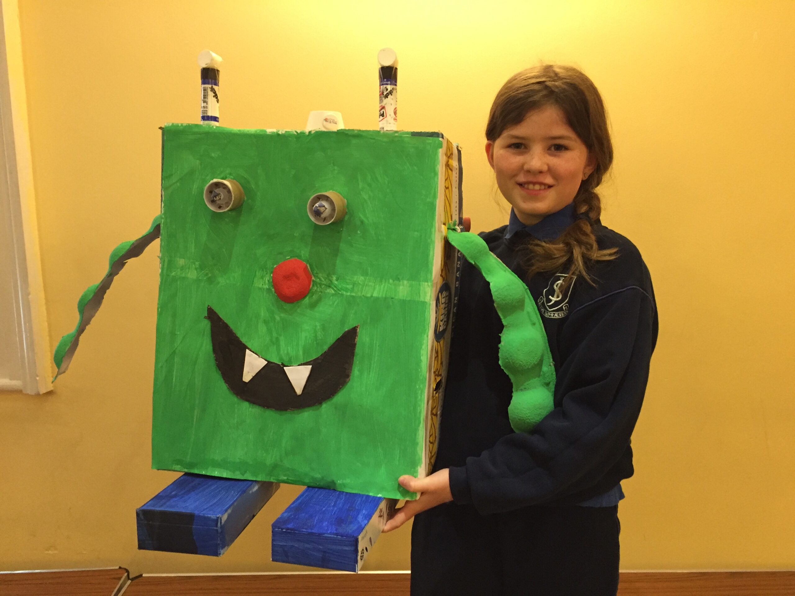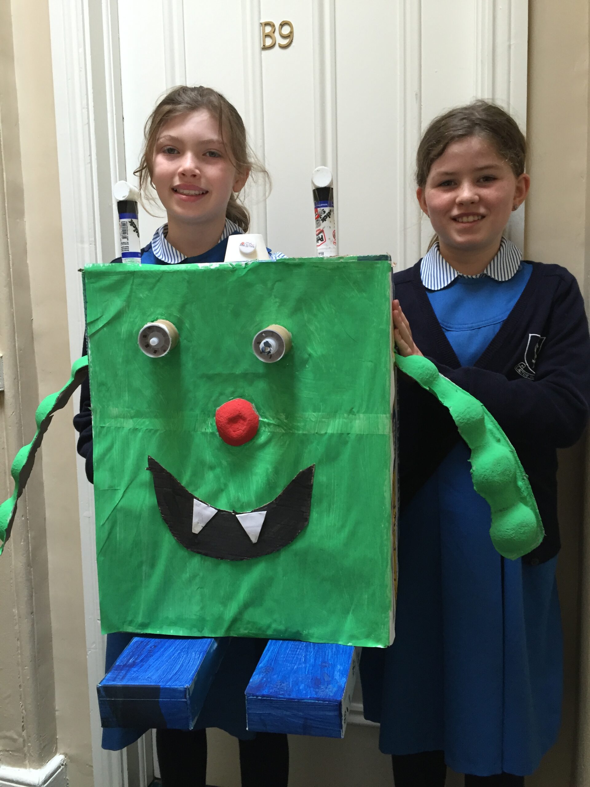 Some classes have gone one step further and not only made posters to promote recycling but they made their posters using recyclable goods. Below is an example of this from Saorla and Lulu in 4th class. We even had a robot creation called Rocky Recycle made by Danu and Gabrielle.